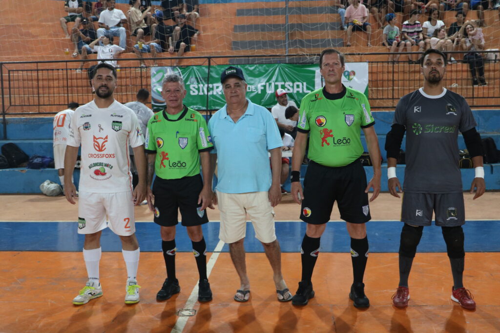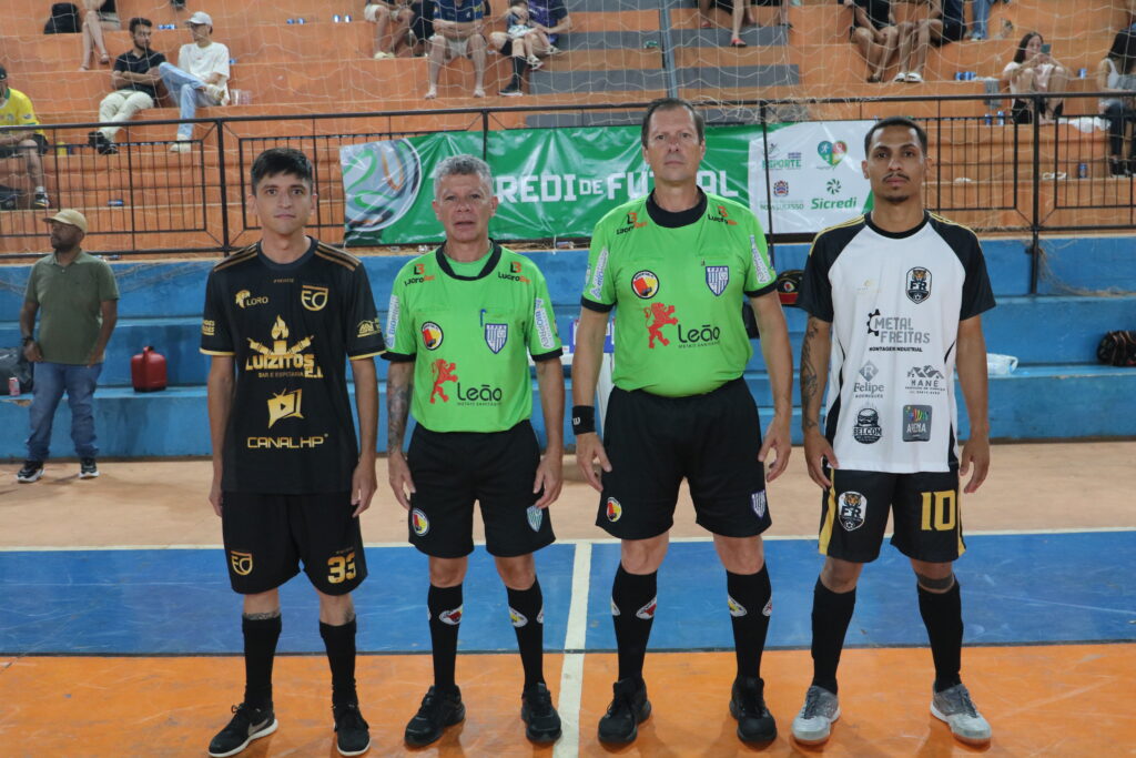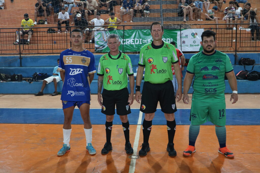 Arbitragem de Adenilson Gregório e José Carlos do Nascimento Também estão presentes na imagem, capitão da equipe do Dinossauros Lourival Jr, e ,Renan capitão da equipe FR Futsal Metal Freitas